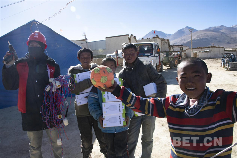 圖為地震發(fā)生第三日,在定日縣曲洛鄉(xiāng)措昂村國家電網(wǎng)工作人員為受災(zāi)群眾安置點(diǎn)通電,孩子們開心地加入工作人員的隊伍中隨時搭把手(攝于2025年1月9日) 攝影:趙振宇
