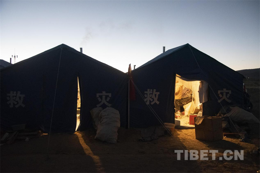 圖為地震發(fā)生第四日,夜幕即將降臨之時定日縣長所鄉(xiāng)雜村受災(zāi)群眾安置點(diǎn)內(nèi)救災(zāi)帳篷中泛起暖光(攝于2025年1月10日) 攝影:趙振宇