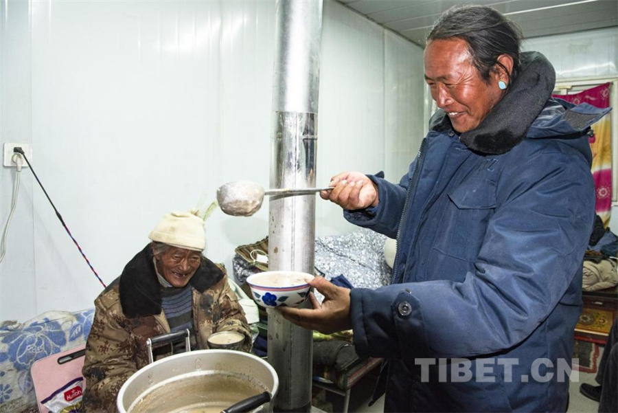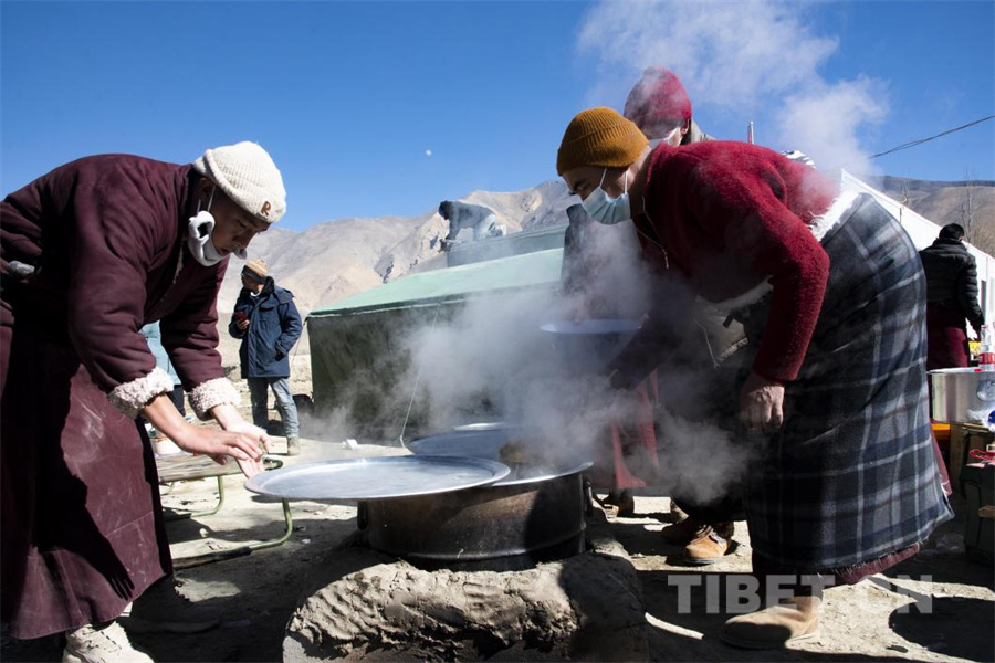 圖為震后第一個藏歷新年古突夜,在定日縣長所鄉(xiāng)茶江村受災(zāi)群眾安置點(diǎn)里,村民扎西正在盛出熱氣騰騰的“古突”(攝于2025年2月27日) 攝影:趙振宇