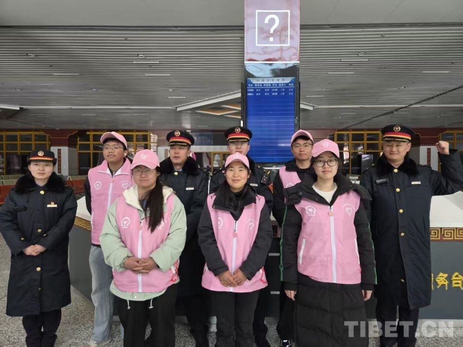 圖為拉薩車站工作人員和志愿者護航旅客平安春運