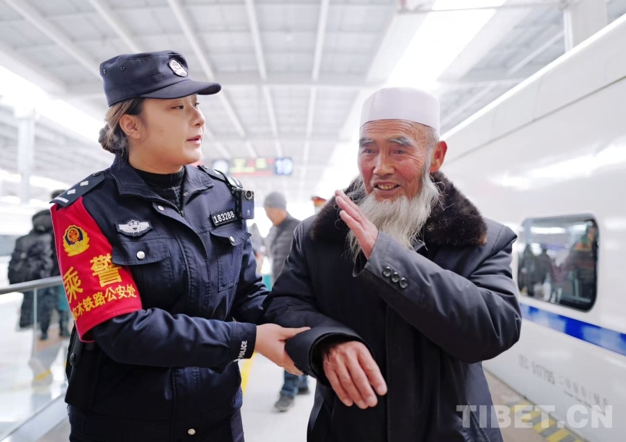 圖為西寧鐵路公安處乘警暖心幫扶返鄉(xiāng)各族群眾,用點(diǎn)滴行動(dòng)守護(hù)旅客平安回家路