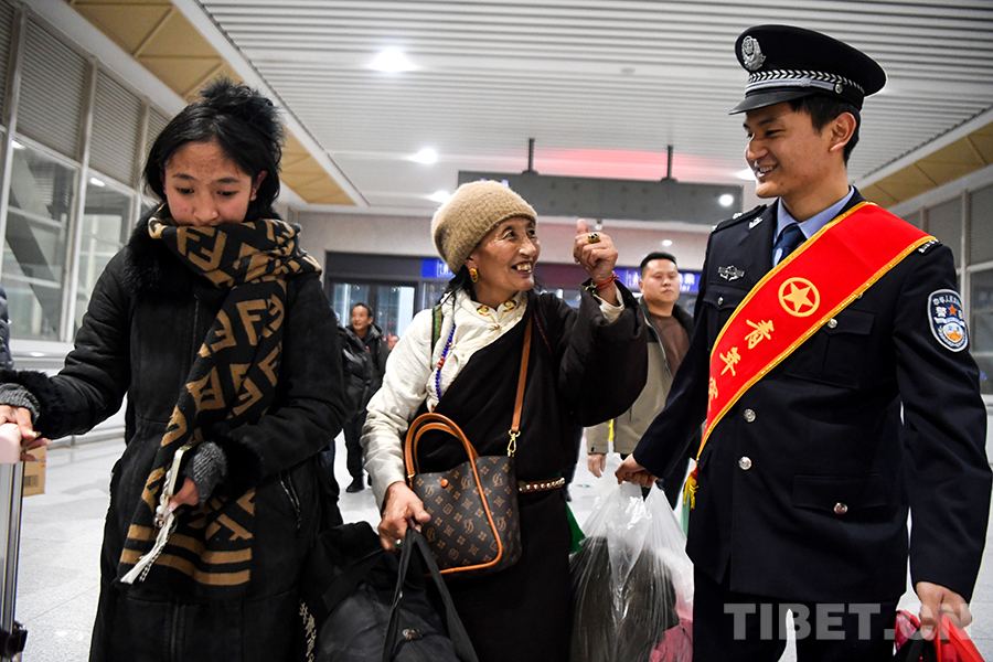 圖為身著藏藍(lán)、肩披紅綬帶的格爾木鐵路公安民警幫助返鄉(xiāng)的藏族阿媽踏上春運旅途
