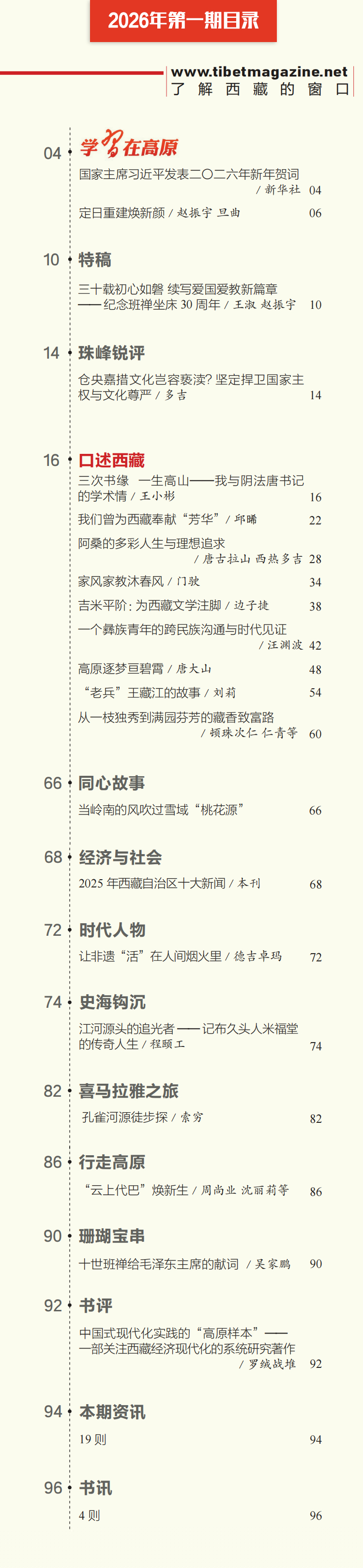 “律回歲晚冰霜少,春到人間草木知?!痹谶@個(gè)春意萌發(fā)的時(shí)節(jié),《中國西藏》漢文版2026年第1期如期與讀者見面了。本期雜志是“口述西藏”??钥谑鍪返姆绞竭B接西藏的歷史與現(xiàn)在,復(fù)原官方檔案之外個(gè)體的體驗(yàn)和集體記憶,讓歷史變得有血有肉,賦予人文價(jià)值和情感力量。