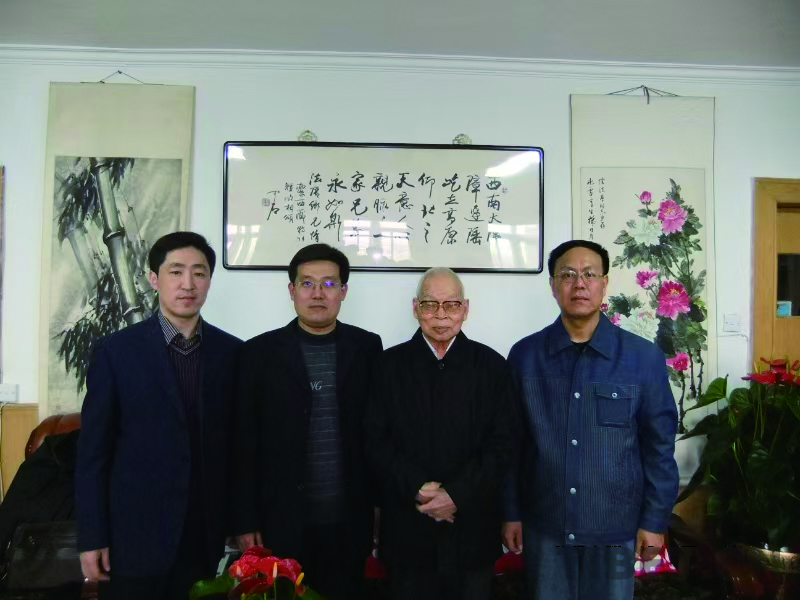 2010年4月,王小彬(右一)、王茂俠(左一)、孫玉華(左二)在北京西四大拐棒胡同陰法唐(右二)同志家中采訪留影。王小彬供圖
