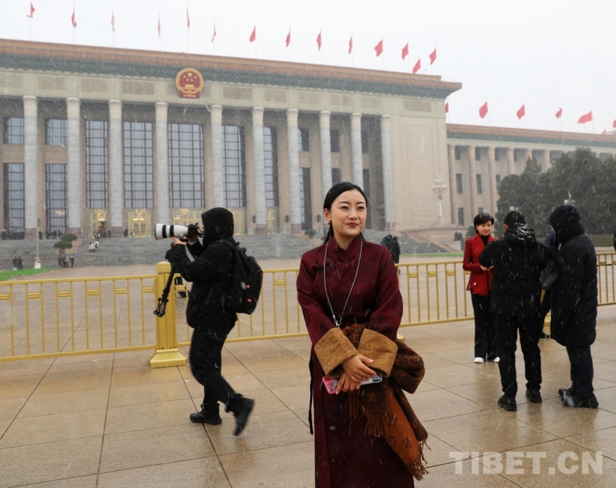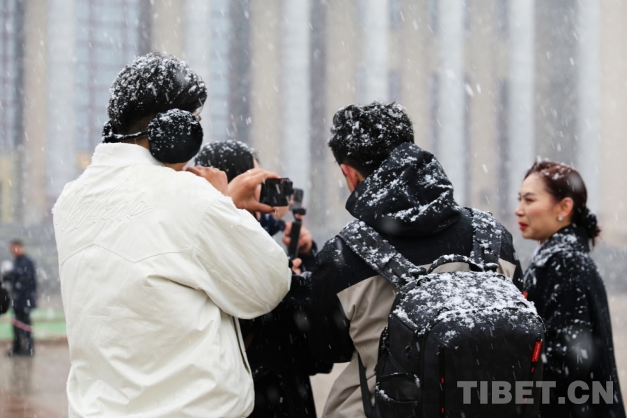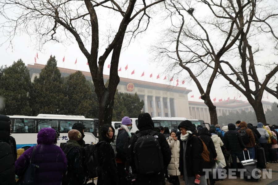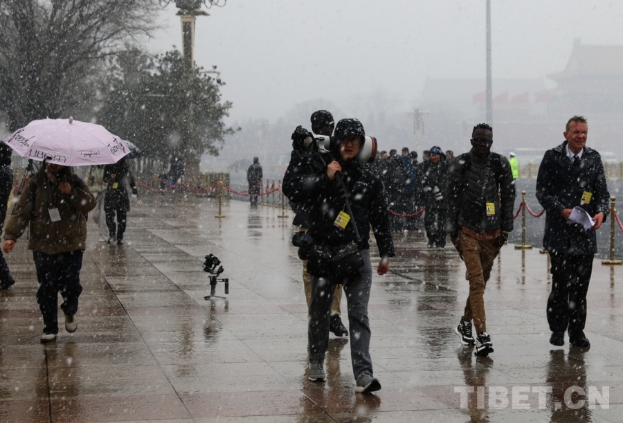 3月4日上午,十四屆全國(guó)人大四次會(huì)議舉行預(yù)備會(huì)議。會(huì)議結(jié)束后,一場(chǎng)春雪不期而至。在紛揚(yáng)的大雪中,康巴衛(wèi)視記者正在工作。攝影:劉莉
