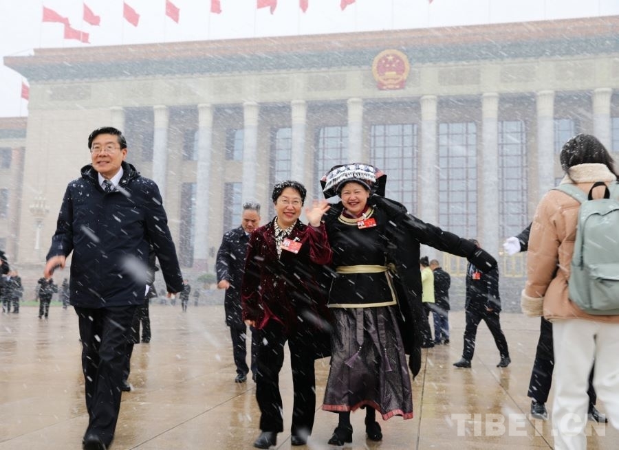 3月4日上午,十四屆全國(guó)人大四次會(huì)議舉行預(yù)備會(huì)議。會(huì)后,一場(chǎng)春雪不期而至。走出會(huì)場(chǎng)的全國(guó)人大代表、廣西金秀瑤族自治縣桐木中學(xué)副校長(zhǎng)梁麗斌向記者們揮手致意。