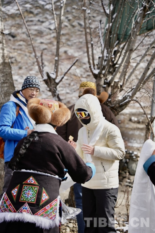 措玉村村民向游客敬獻(xiàn)吉祥哈達(dá)