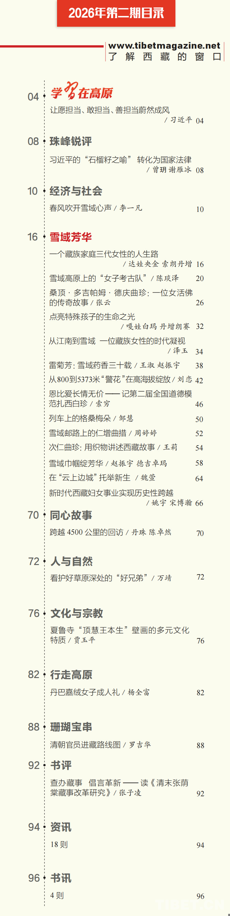 “等閑識(shí)得東風(fēng)面,萬(wàn)紫千紅總是春。”在這春意盎然的時(shí)節(jié),《中國(guó)西藏》漢文版2026年第2期如期與讀者見(jiàn)面了。本期雜志是“雪域芳華”??覀儗⒛抗馔断蜓┯蚋咴系呐浴齻兪悄赣H、是勞動(dòng)者、是守護(hù)者,也是時(shí)代的書(shū)寫(xiě)者。女性不僅見(jiàn)證了歷史的巨變,更以自身的堅(jiān)韌與智慧,成為推動(dòng)社會(huì)進(jìn)步不可或缺的力量。透過(guò)一個(gè)個(gè)鮮活的人物故事,本期專刊呈現(xiàn)雪域高原上那股堅(jiān)韌且不斷生長(zhǎng)的“她力量”。