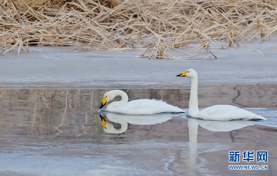 兩只天鵝在千姿湖中游弋。新華網(wǎng) 宋忠勇 攝