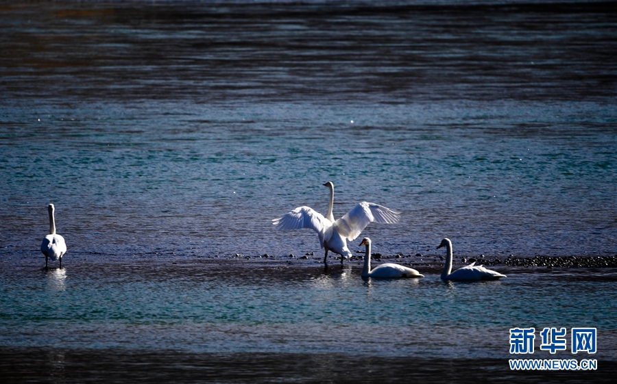 一群天鵝在千姿湖嬉戲。新華網(wǎng) 宋忠勇 攝