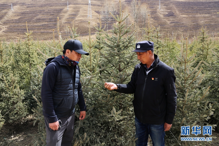 公保旦增(右)與扎巴江才正在查看樹木長勢(shì)情況。新華網(wǎng) 卡婭梅朵 攝