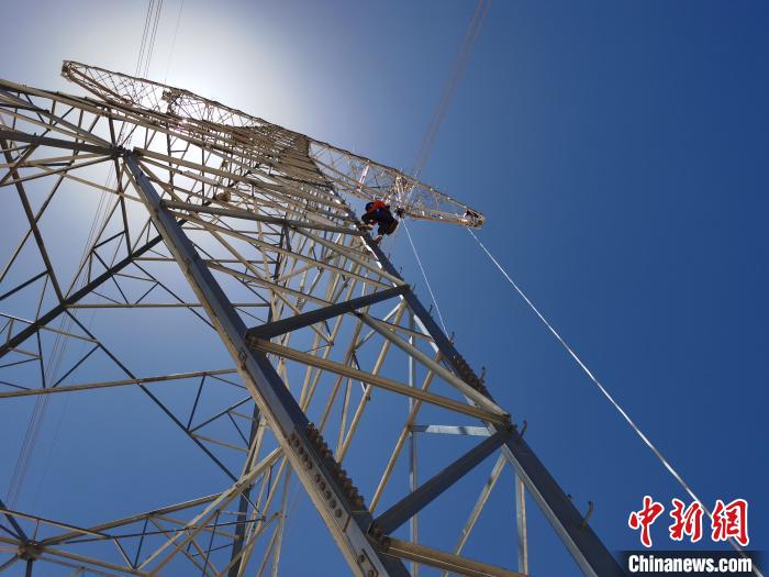 5月17日,在海拔4700多米的五道梁地區(qū),在“電力天路”±400千伏柴拉線636號(hào)塔上,3名作業(yè)人員正在更換絕緣子串,塔下6名作業(yè)人員在全力配合,工作負(fù)責(zé)人馬興義正仰頭觀察著塔上的一舉一動(dòng),時(shí)不時(shí)提醒工作注意事項(xiàng)。