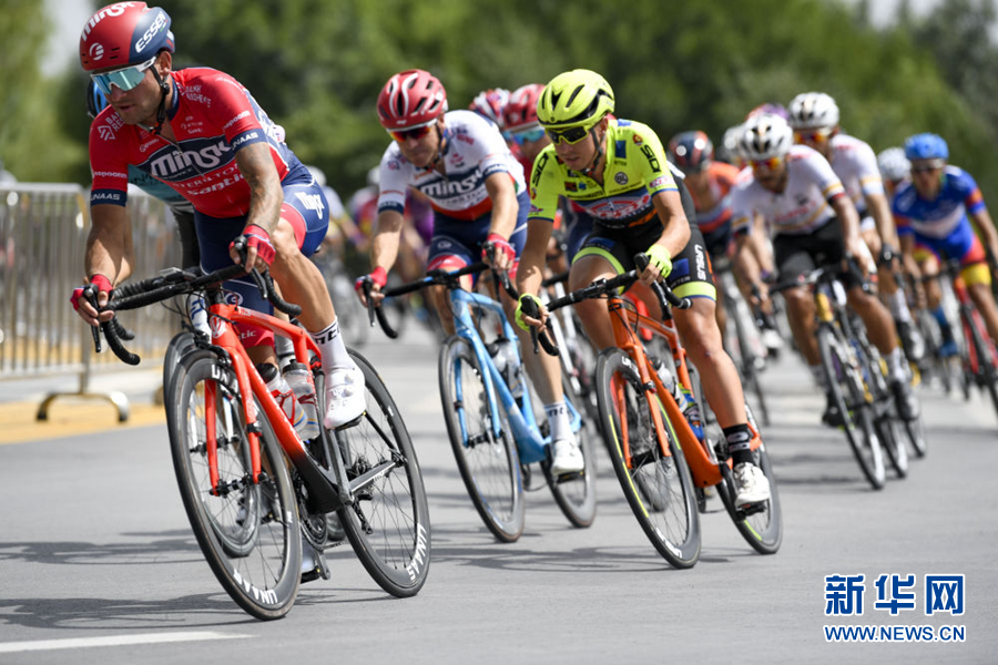 2019年7月27日,參賽車手在比賽中。當(dāng)日,第十八屆環(huán)青海湖國(guó)際公路自行車賽結(jié)束最后一個(gè)賽段——寧夏銀川繞圈賽的角逐。新華社 馮開(kāi)華 攝