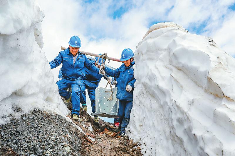 6月10日,阿壩州理縣夾壁—馬塘110千伏輸變電工程,建設(shè)者靠人力抬起沉重的塔材,艱難穿過高達2米的雪墻,前往組塔點位。