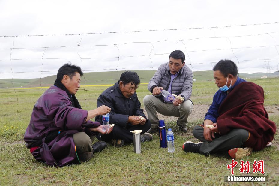 7月21日,青海省海北藏族自治州剛察縣伊克烏蘭鄉(xiāng)剛察貢麻村的索南木旦巴(左一)、仁增才讓(左二)、吉科加(右二)、萬瑪扎西(右一)四人在撿拾著草場垃圾途中,吃餅子,喝礦泉水充饑。2008年,萬瑪扎西路在村支書的支持下,與索南木旦巴、仁增才讓、吉科加三個人組建了義務(wù)環(huán)保隊,自此一干就是12年。他們在撿拾垃圾的同時進行著環(huán)保宣傳,希望從源頭減少垃圾。仁增才讓說:“現(xiàn)在草原上的垃圾幾乎是看不到了。”中新社記者 馬銘言 攝