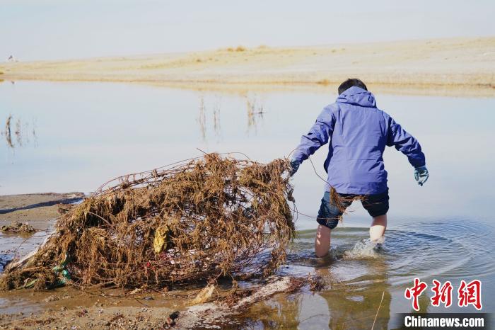 寒風(fēng)凜冽,湖水冰涼,寒徹入骨。十月中旬的青海湖湖濱地區(qū)最低氣溫達(dá)零下二攝氏度,部分河流開始結(jié)冰,青海湖牧民巡護(hù)隊隊員尖木措卷起褲腿,邁入冰冷的湖水,徒手將陷入淤泥中的廢棄鐵絲拉上岸。幾分鐘后,尖木措裸露在外的小腿早已凍得通紅。