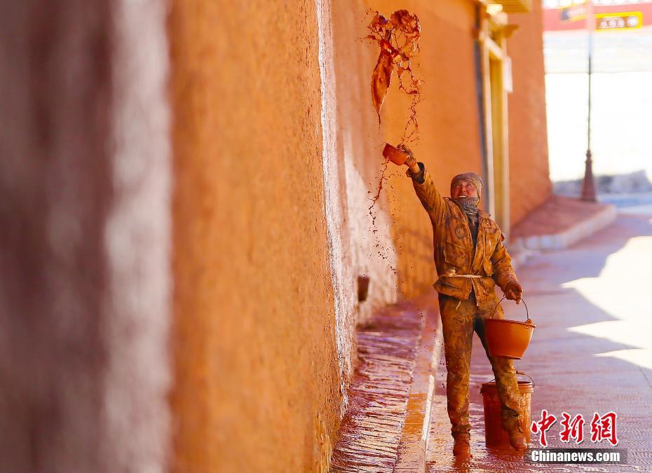 11月9日,甘肅夏河縣拉卜楞寺內(nèi),匠人用傳統(tǒng)潑灑方法為寺院墻壁“美顏”。中新社記者 高展 攝