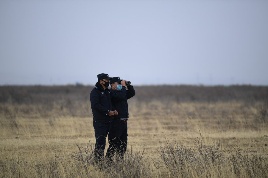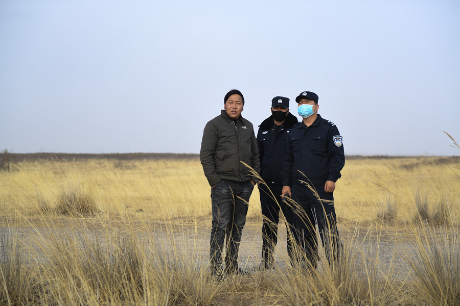 11月20日,剛察縣森林公安局哈爾蓋派出所民警秦輝武(右一)和輔警東知布在特護(hù)區(qū)內(nèi)進(jìn)行日常巡護(hù)。新華網(wǎng) 潘彬彬 攝