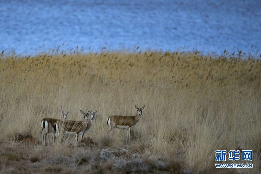 四只鵝喉羚在都蘭湖國家濕地公園內活動。(11月21日攝)新華網(wǎng) 潘彬彬 攝