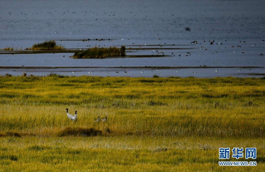 生活在都蘭湖國家濕地公園內的黑頸鶴一家。(9月24日攝)新華網(wǎng) 潘彬彬 攝