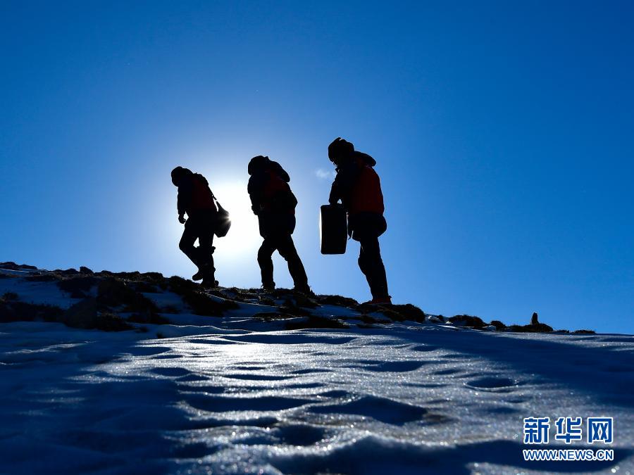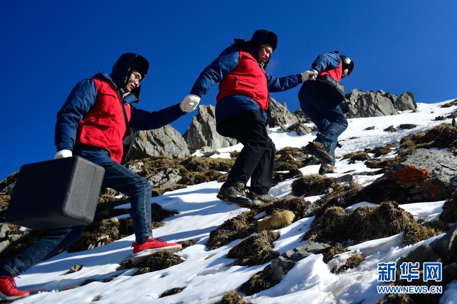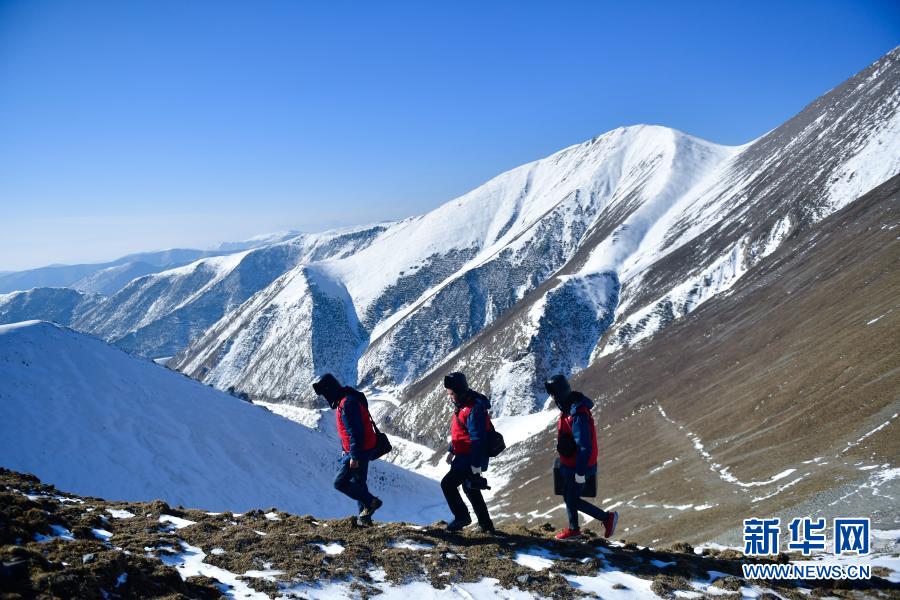 1月21日,國家電網(wǎng)西寧供電公司輸電運檢中心運檢人員在登山巡檢。新華社記者 張龍 攝