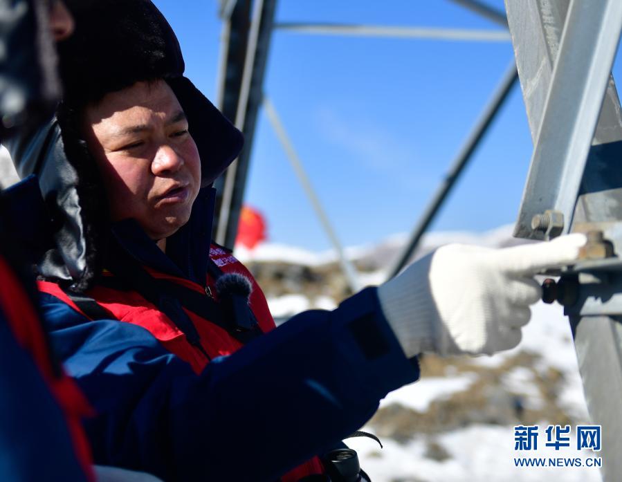 1月21日,國家電網(wǎng)西寧供電公司輸電運檢中心運檢人員董進軍在測量線路耐張線夾溫度。新華社記者 張龍 攝