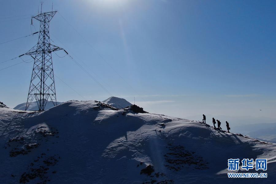 1月21日,國家電網(wǎng)西寧供電公司輸電運檢中心運檢人員在登山巡檢(無人機照片)。新華社記者 張龍 攝