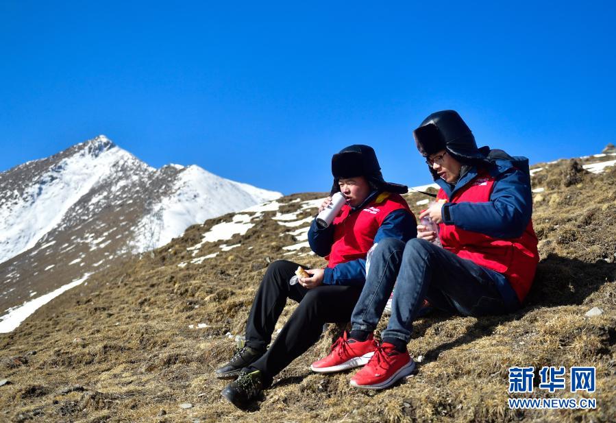1月21日,國家電網(wǎng)西寧供電公司輸電運檢中心運檢人員在巡檢途中吃午飯。新華社記者 張龍 攝