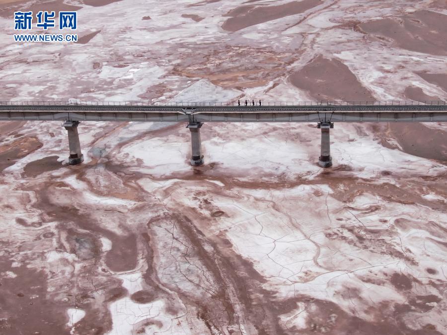 2月5日,沱沱河站派出所的巡線民警在青藏鐵路沱沱河大橋巡查(無人機(jī)照片)。新華社記者 張龍 攝