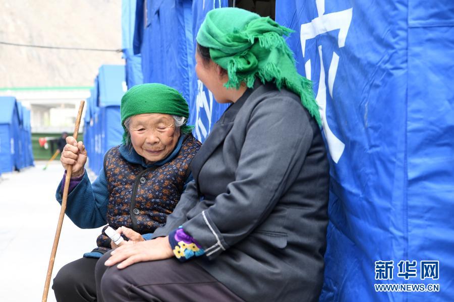 3月16日,在舟曲縣果耶鎮(zhèn)磨里村、果耶村滑坡災(zāi)害應(yīng)急避險(xiǎn)臨時(shí)安置點(diǎn),受災(zāi)群眾在帳篷外聊天。新華社記者 范培珅 攝