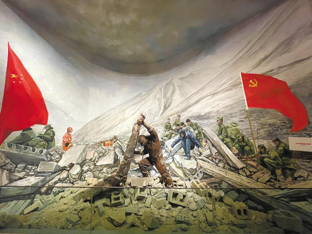 繼續(xù)向前,一座雕塑映入眼簾。雕塑再現(xiàn)了當(dāng)時(shí)抗震救災(zāi)過(guò)程中,我們可愛(ài)的人民子弟兵因?yàn)闆](méi)有專業(yè)的救災(zāi)器械,用自己的肩膀扛起水泥板,用自己的雙手挖出受災(zāi)群眾的感人場(chǎng)面。而旁邊的一面鮮紅黨旗,更是給受災(zāi)群眾樹(shù)立起了主心骨,支撐起了玉樹(shù)抗震救災(zāi)精神。