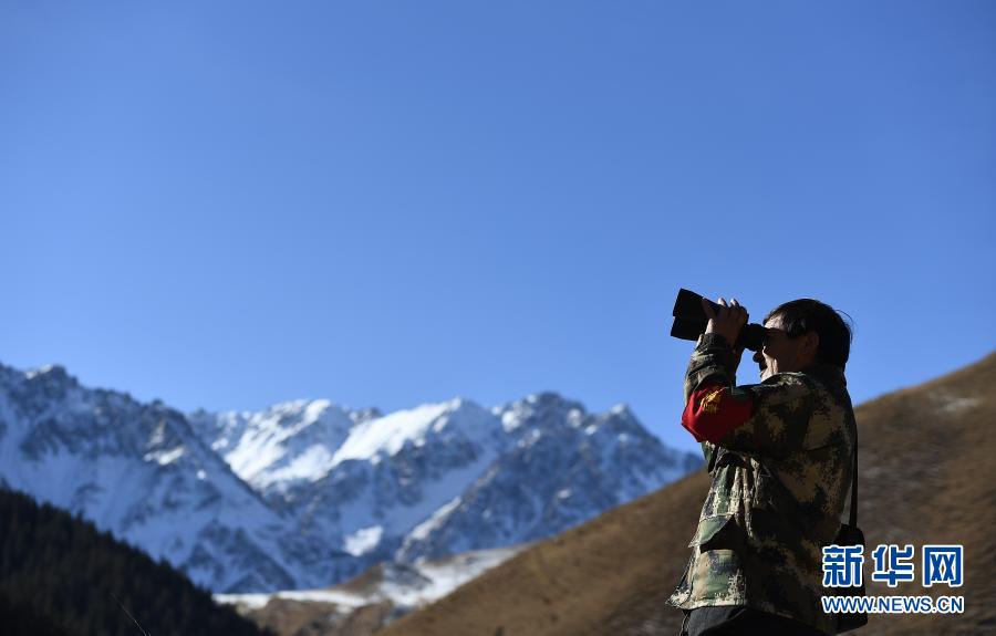 4月22日,祁連山國家公園油葫蘆管護站生態(tài)管護員王學(xué)清在巡護途中使用望遠鏡監(jiān)測野生動物。新華社記者 吳剛 攝