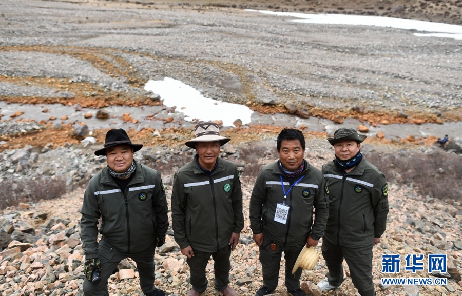 4月22日,祁連山國家公園油葫蘆管護站生態(tài)管護員德康、普華才讓、王學(xué)清、朱江云(從左至右)在巡護途中合影。新華社記者 張宏祥 攝