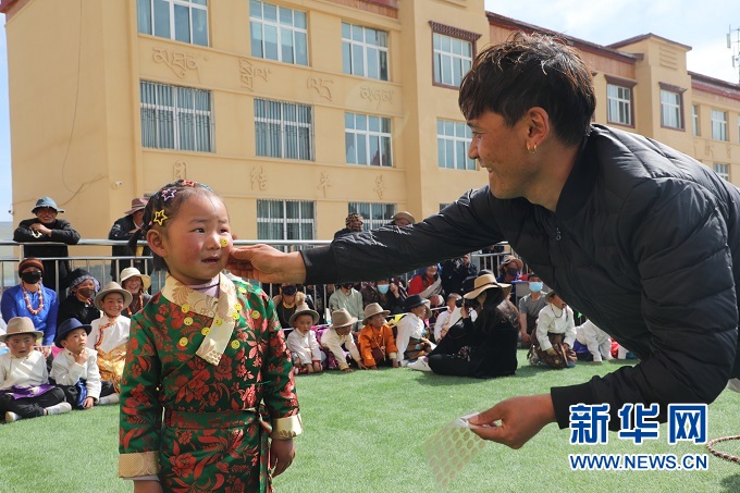 今年的“六一”活動上,貢巴幼兒園的小朋友們表演了藏族歌舞、《三字經(jīng)》朗誦等精彩節(jié)目。小男孩們穿上藏袍、戴上氈帽,活潑地跳起鍋莊。小女孩們盛裝打扮,頭上用彩色頭繩編滿了小辮兒,腰間特色銀飾叮當作響。親子互動游戲笑聲不斷,欄桿外的老阿媽看得興致盎然。