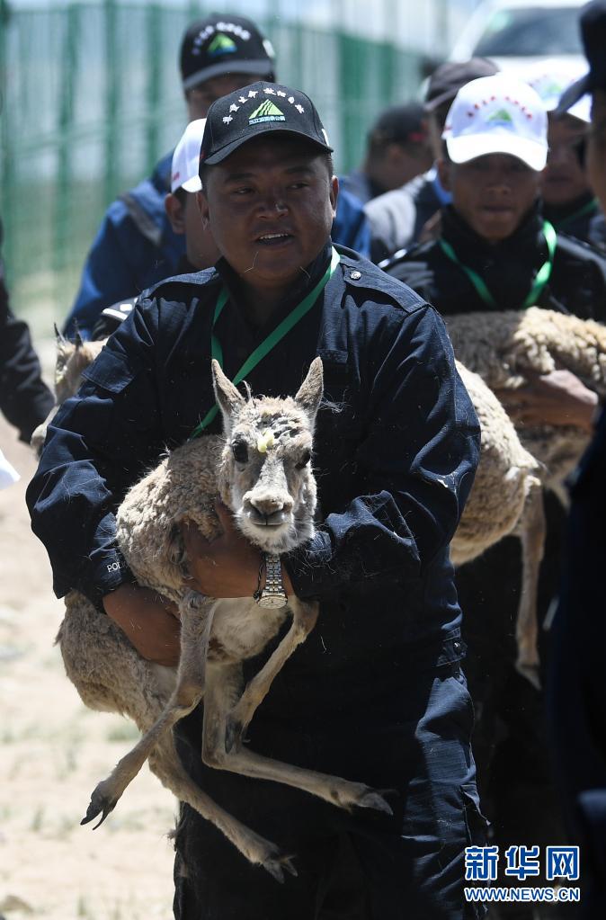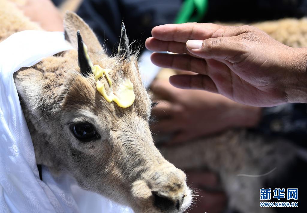 7月7日,在可可西里索南達(dá)杰保護(hù)站野生動(dòng)物救助中心,可可西里巡山隊(duì)員按照風(fēng)俗為放歸的藏羚羊戴上哈達(dá)表達(dá)祝福。新華社記者 張龍 攝