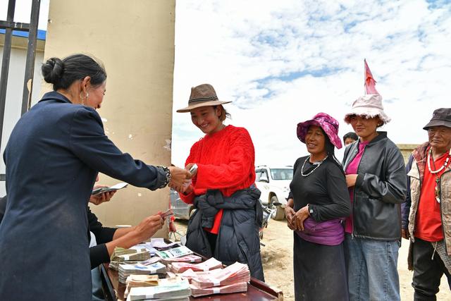 圖為藏族農牧民在領勞務收入。新華社記者 李鑫 攝