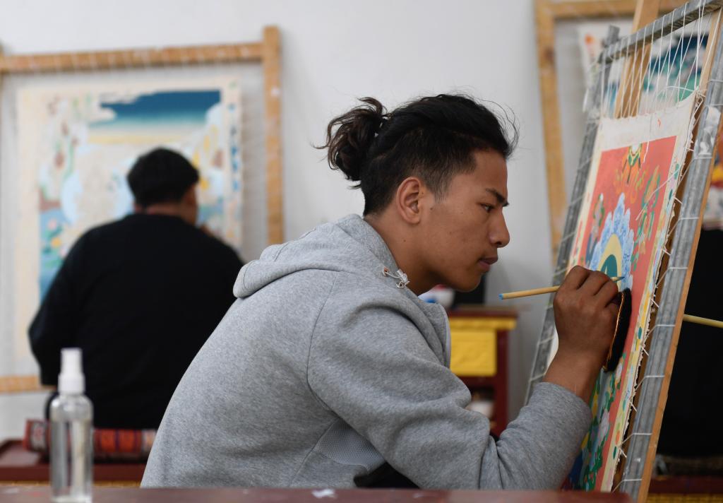 9月2日,黃南藏族自治州同仁市熱貢藝術(shù)完全小學(xué)六年級(jí)學(xué)生才讓央宗在唐卡繪畫老師旦巴的指導(dǎo)下畫畫。新華社記者 馬千里 攝