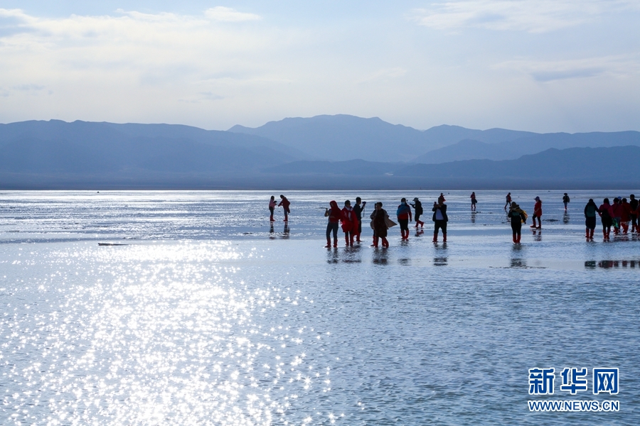 游客在茶卡鹽湖“天空之鏡”景區(qū)游玩。新華網(wǎng) 卡婭梅朵 攝