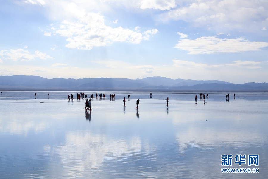 游客在茶卡鹽湖“天空之鏡”景區(qū)漫步。新華網(wǎng) 卡婭梅朵 攝