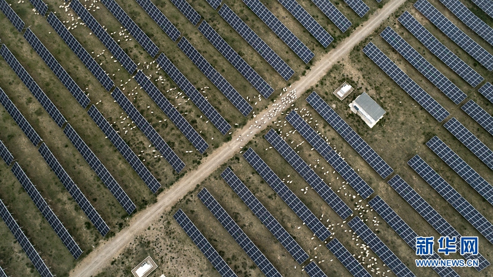 羊群在青海省海南藏族自治州共和光伏產(chǎn)業(yè)園吃草(無人機照片)。新華社記者 吳剛 攝