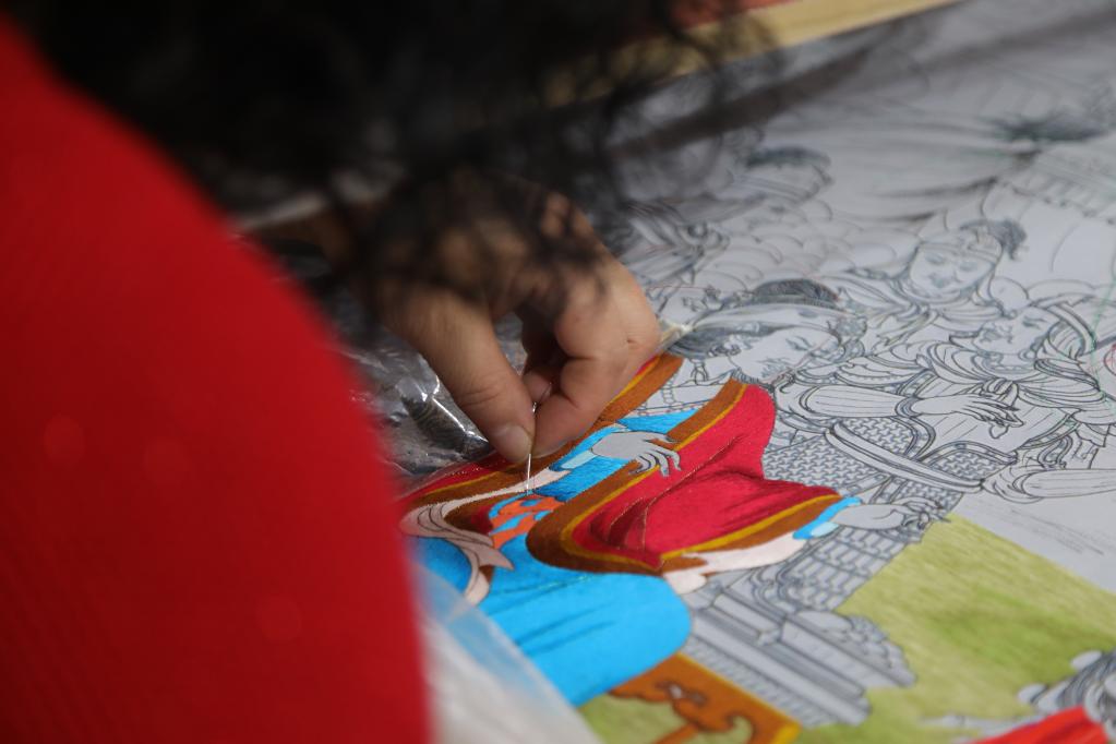 平滑的線條、細(xì)膩的針腳、傳統(tǒng)的繡法、新穎的設(shè)計(jì)……繡坊內(nèi),繡娘們聚精會(huì)神穿針引線,拉毛葉忠仔細(xì)檢查繡娘們的作品,用藏繡技藝講述格薩爾王的故事是一次創(chuàng)新。