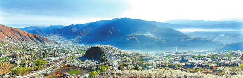金川縣萬畝梨花綻放,雪白的梨花與藍(lán)天、白云、民居、碉樓共同繪出一幅“世外梨園”的美景,綿延百余公里。 (金川縣委宣傳部供圖)