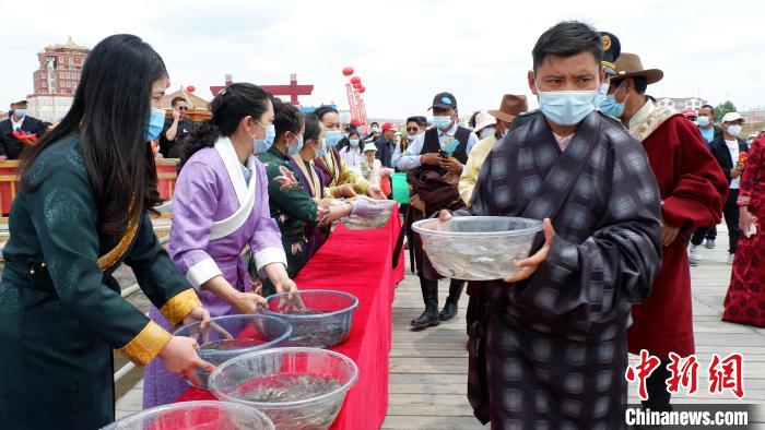 圖為民眾增殖放流青海湖裸鯉。李雋 攝