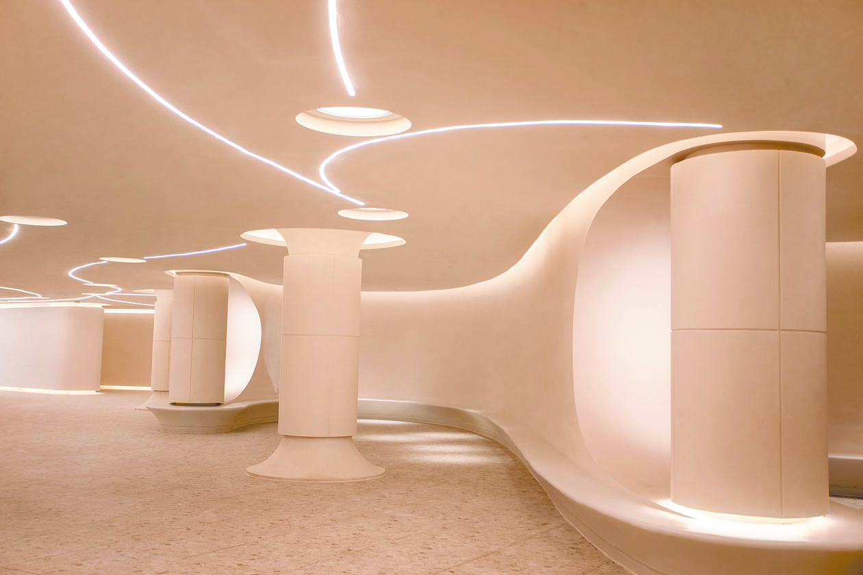 “看見九寨”大樓內(nèi)的10余個空間里,設(shè)計團隊用不同的色彩和科技表現(xiàn)手法表達出不同的舒緩風格,治愈人心。“獨自醒來”藝術(shù)館運用弧形和曲線,將空間切割出曼妙的身形,輕盈靈動,淺黃柔色的燈光彌漫著溫柔氣息;以白色調(diào)為主的“九寨時光”圖書館,能讓人從浮躁中快速安靜下來。