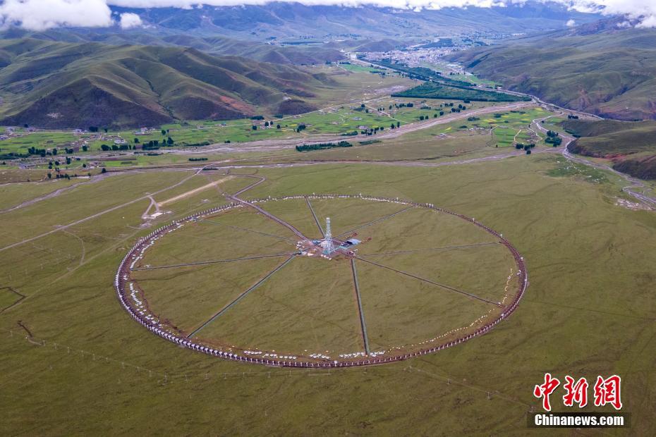 6月29日,四川稻城,航拍空間環(huán)境地基綜合監(jiān)測網(wǎng)(子午工程二期)全景,中間為定標(biāo)塔。四川省甘孜州稻城縣境內(nèi),國家重大科技基礎(chǔ)設(shè)施空間環(huán)境地基綜合監(jiān)測網(wǎng)(子午工程二期),正在進(jìn)行緊張的設(shè)備安裝,預(yù)計2022年底完成天線安裝調(diào)試工作。 中新社記者 劉忠俊 攝