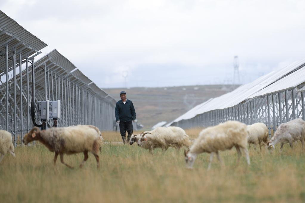 牧民在共和縣塔拉灘華能青海公司光伏電站內放羊(6月9日攝)。新華社記者 張龍 攝