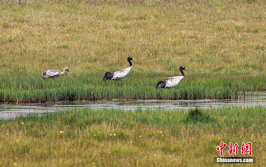 8月9日,祁連山南麓的青海省海北藏族自治州祁連縣央隆鄉(xiāng),三只黑頸鶴正在央隆濕地悠閑踱步,不時發(fā)出鳴叫聲。[詳細(xì)]