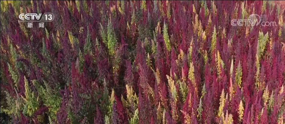 近年來,烏蘭縣采取了藜麥多品種繁育的方式,在這片1000畝的藜麥良種繁育田里,就有700多種性狀不同的藜麥,工作人員通過比對和良種選育,篩選適宜品種進行推廣。不同品種的藜麥成熟后,藜麥穗呈現(xiàn)出火紅、金黃、紫紅等多種色彩,藜麥田宛如一幅色彩斑斕的油畫。在陽光的照射下,隨風(fēng)搖擺的藜麥穗和村民們忙碌的身影組成了秋日的豐收美景圖。