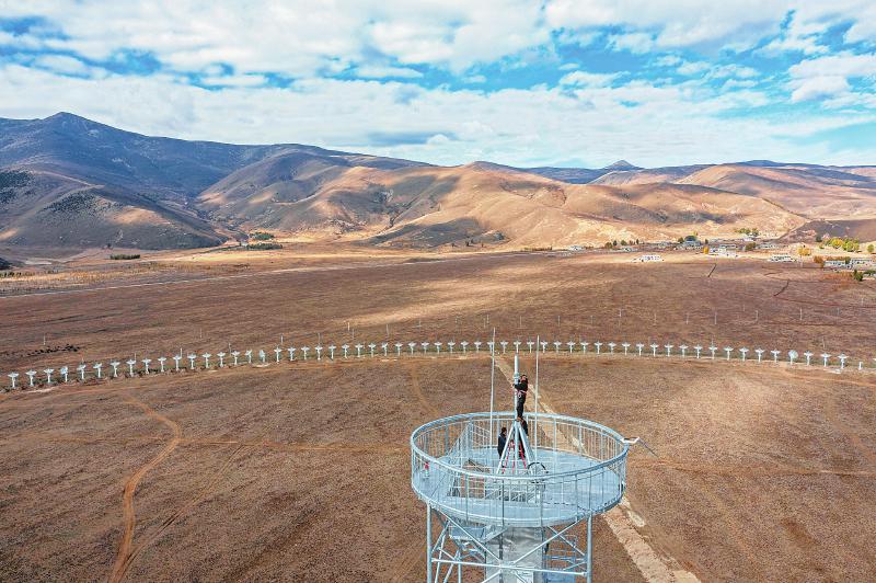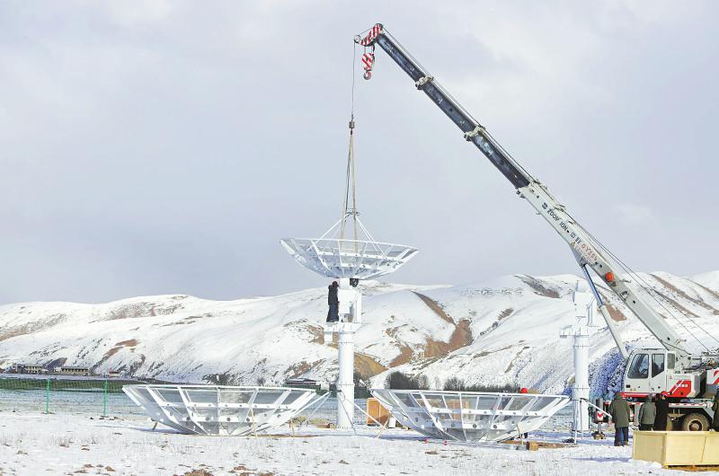 2022年11月13日 工人正在安裝圓環(huán)陣太陽(yáng)射電成像望遠(yuǎn)鏡設(shè)備的最后一個(gè)天線面。