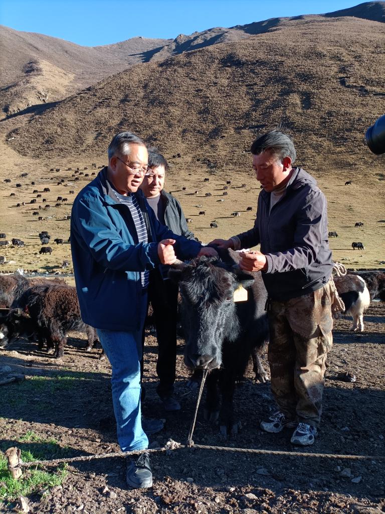 2022年4月26日,宋仁德(左)帶領(lǐng)團(tuán)隊(duì)成員在玉樹藏族自治州稱多縣歇武鎮(zhèn)下賽巴村示范基地指導(dǎo)牦牛高效養(yǎng)殖技術(shù)。(受訪對(duì)象供圖)